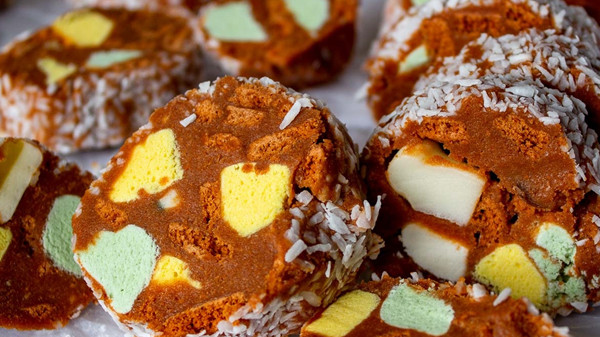 Lolly cake is a favorite dessert of many New Zealanders, consisting of crushed malt biscuits, colorful marshmallows, butter, and condensed milk. The cake is often topped with grated coconut and is served sliced. Malt biscuits are used because their unique flavor cuts the sweetness of the marshmallows.Lolly cake is a staple at various festive events such as birthdays and similar celebrations.